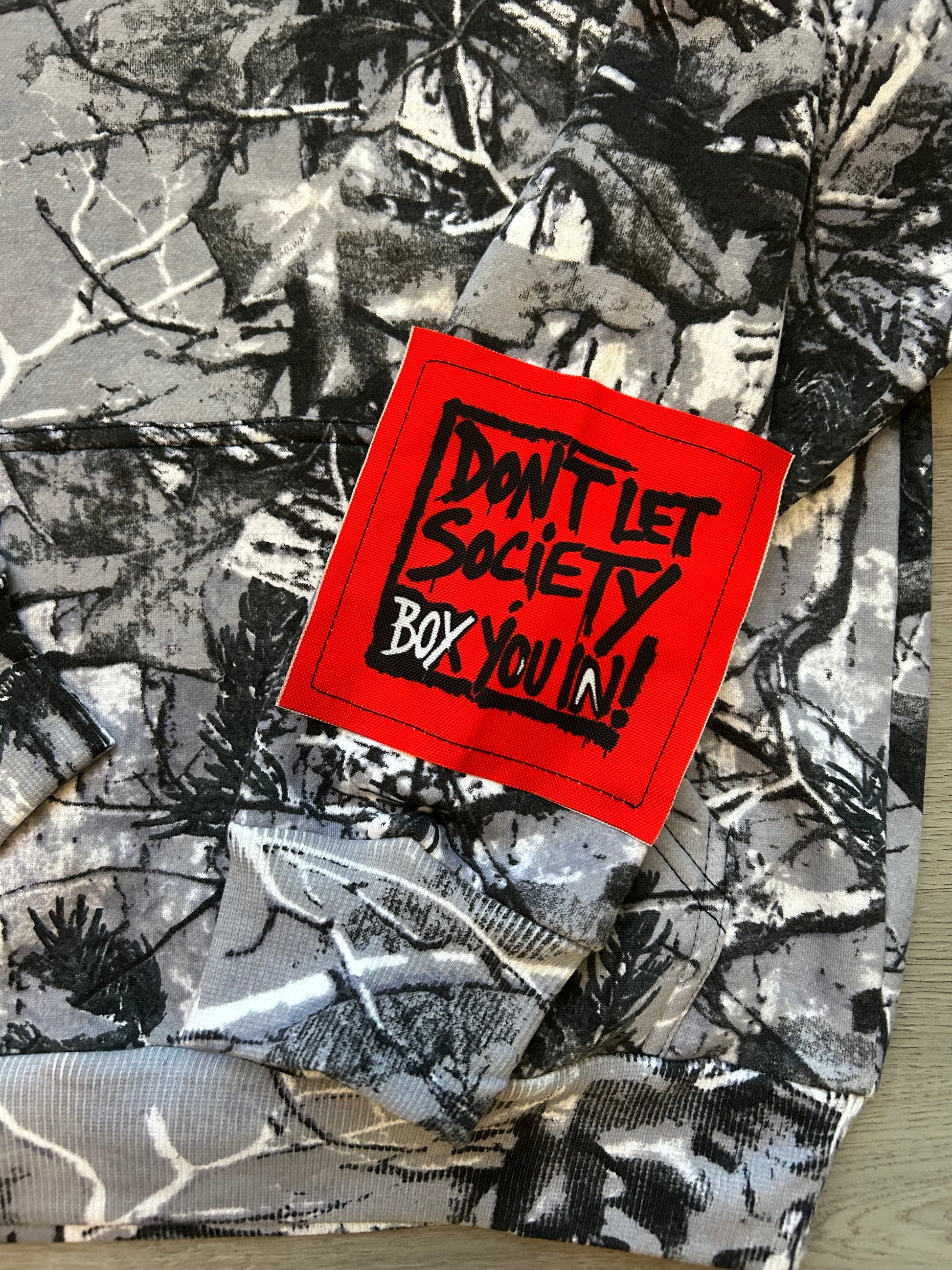 THIS HOODIE IS PERFECT FOR THE FALL WEATHER! IT'S MEDIUM WEIGHT SO IT CAN BE WORN ON COOLER NIGHTS OR WARMER DAYS! THE REAL TREE CAMO IS STYLISH AND HAS TWO PATCHES ASSEMBLED! BOTH PATCHES REPRESENT A PRINCIPLE WE LIVE BY... DON'T LET SOCIETY BOX YOU IN!